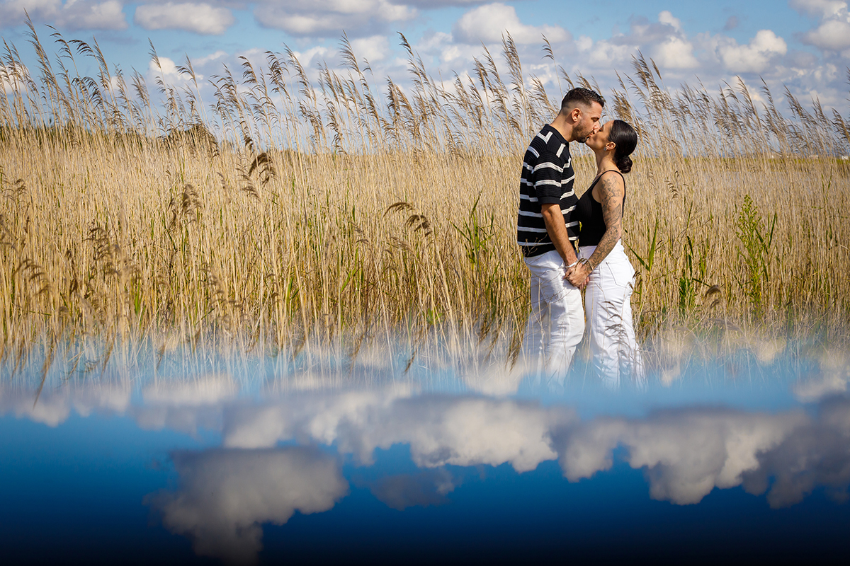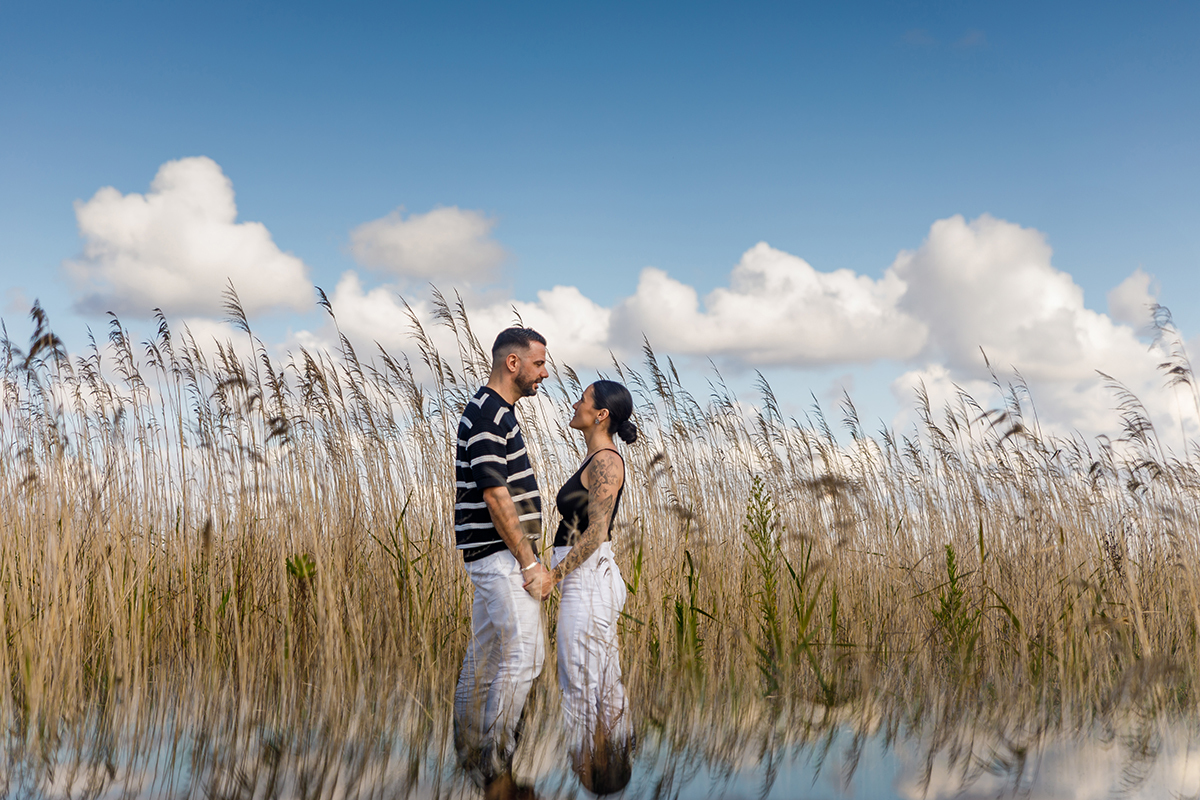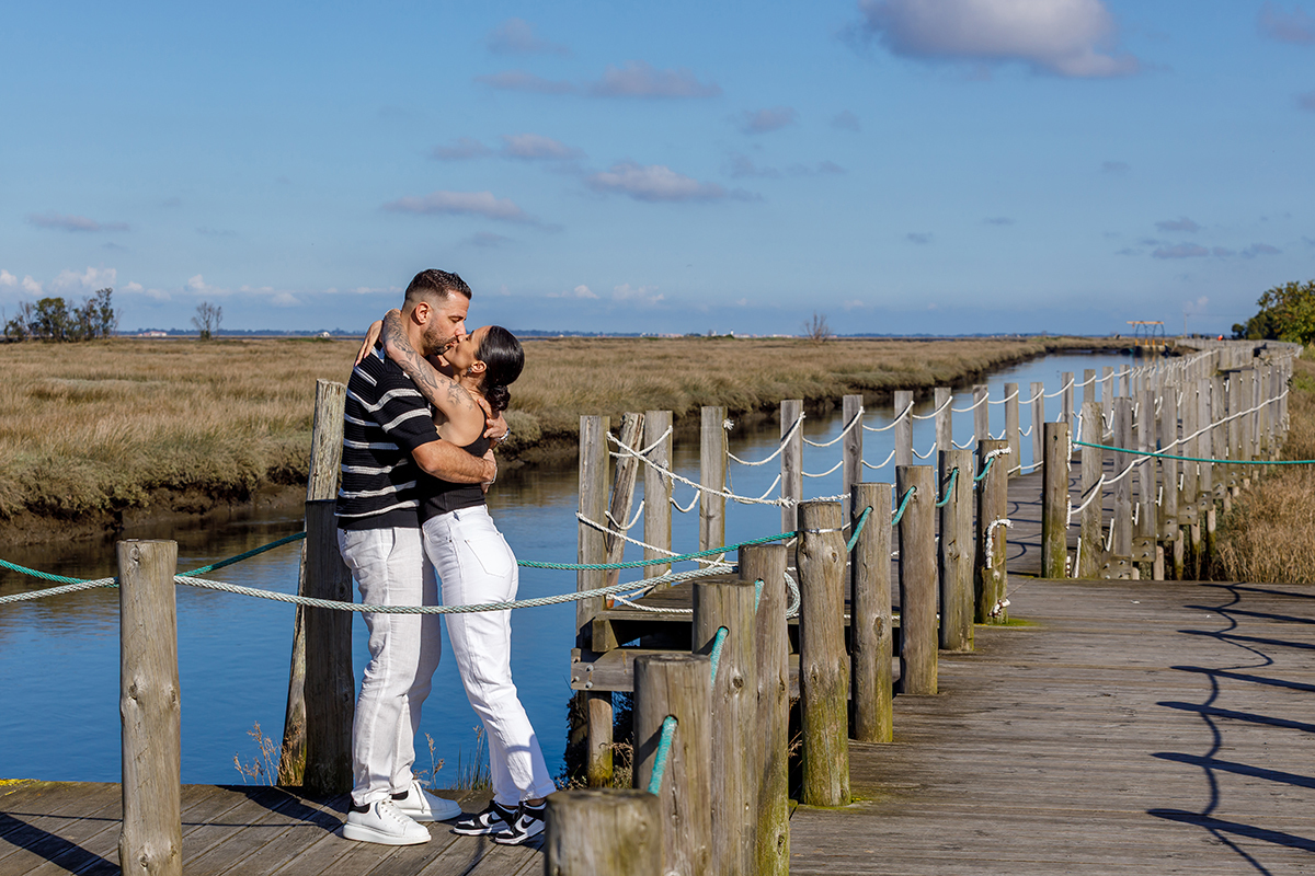 Começámos a tarde nos icónicos passadiços ao lado da ria. Ali, entre a madeira e o horizonte aberto, a tranquilidade da água permitiu-nos captar a cumplicidade natural do casal. Como fotografo-casamento sediado em Tondela, adoro o desafio de fotografar fora da minha zona de conforto habitual, e a luz única da ria de Aveiro é um presente para qualquer lente.
